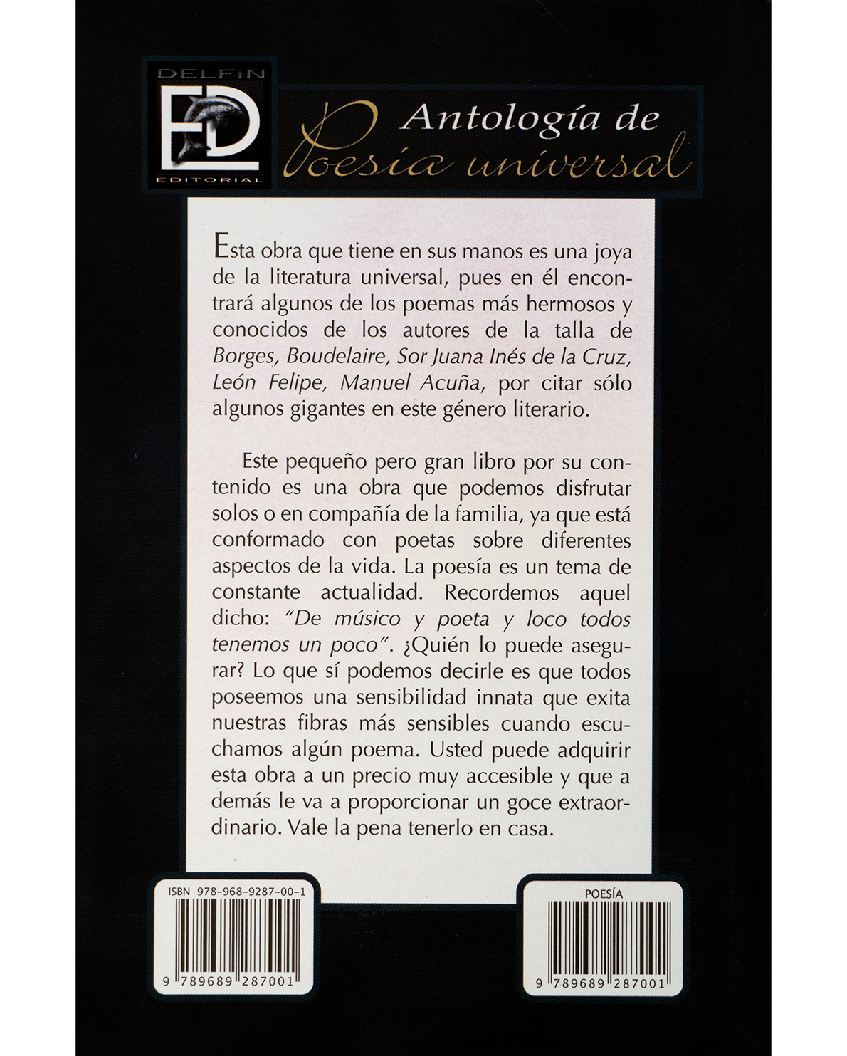 La Antología de Poesía Universal de Delfín Editorial es un homenaje a la belleza de la palabra y a la sensibilidad humana. En sus páginas se reúnen obras de autores inmortales como Charles Baudelaire, Jorge Luis Borges, Sor Juana Inés de la Cruz, Manuel Acuña, León Felipe, entre otros. Este volumen invita a redescubrir los temas universales del amor, la vida, la muerte y la esperanza a través de la poesía. Perfecto para disfrutar en soledad o compartir en familia, este libro ofrece una experiencia literaria profunda y atemporal, ideal para quienes aprecian la belleza y la emoción en su máxima expresión.
