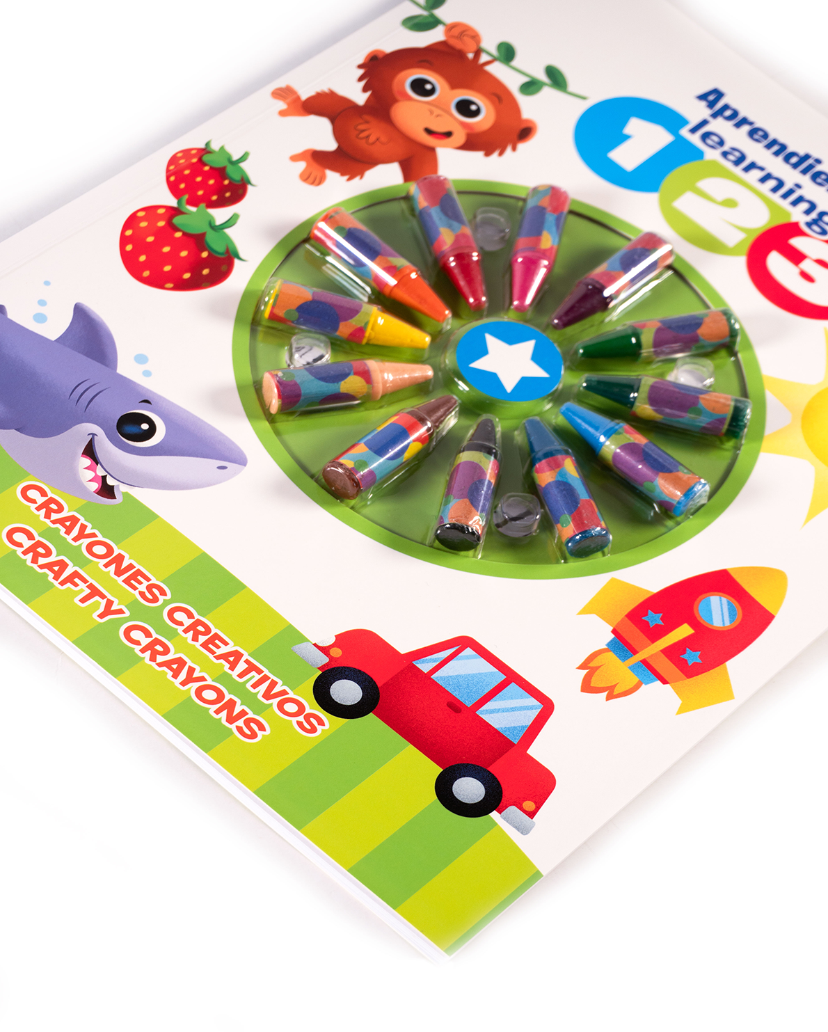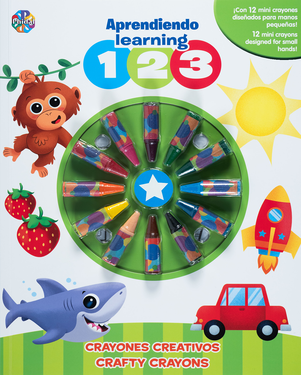Con 12 mini crayones de colores vivos, especialmente diseñados para manos pequeñas, los pequeños podrán colorear mientras aprenden a reconocer los números del 1 al 10, acompañados de adorables personajes como monos, patitos, peces, tiburones y más.