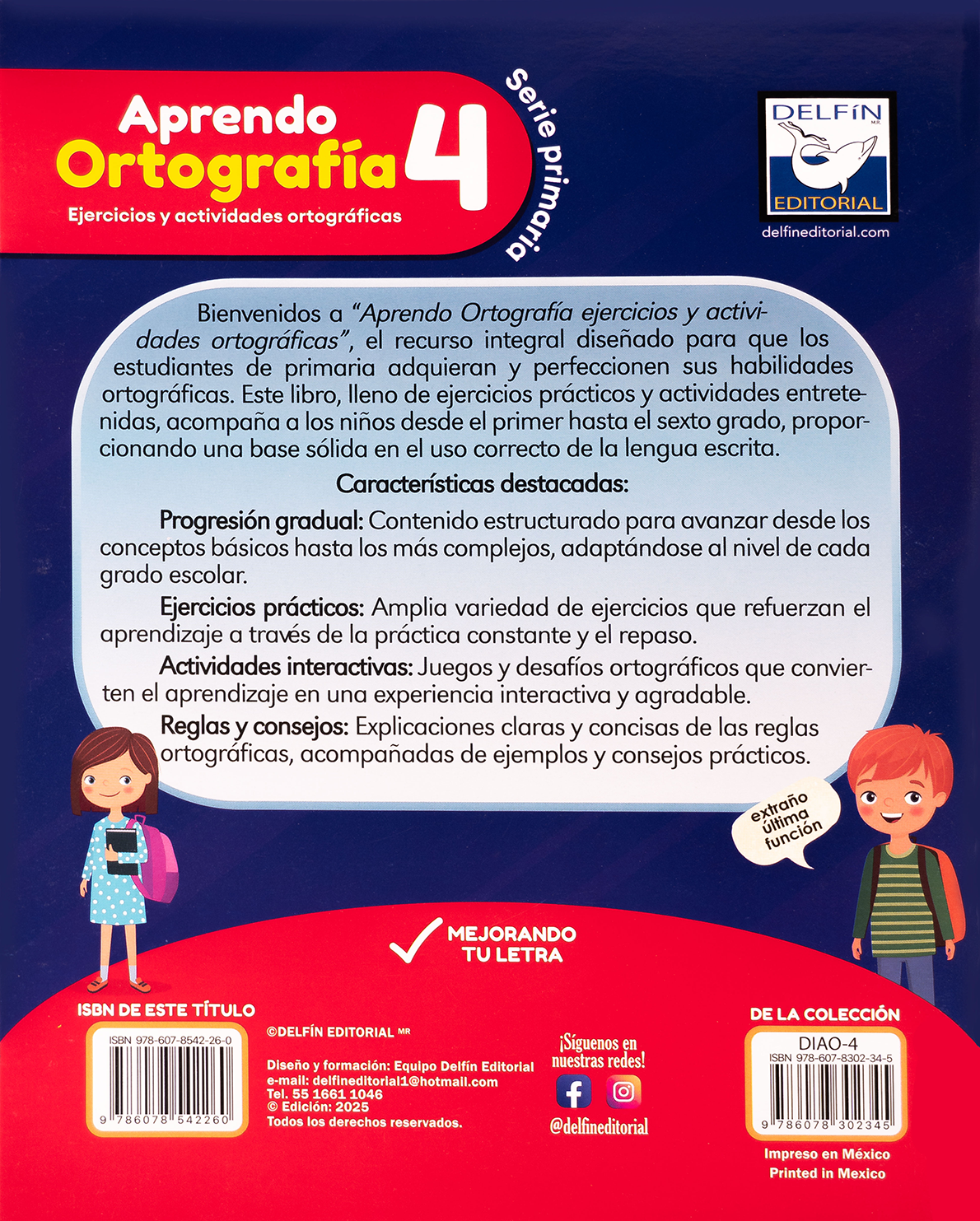 Aprendo Ortografía 4 es el cuarto volumen de la serie primaria de Delfín Editorial, especialmente elaborado para alumnos de cuarto grado que desean seguir fortaleciendo sus habilidades en el uso correcto del español escrito.