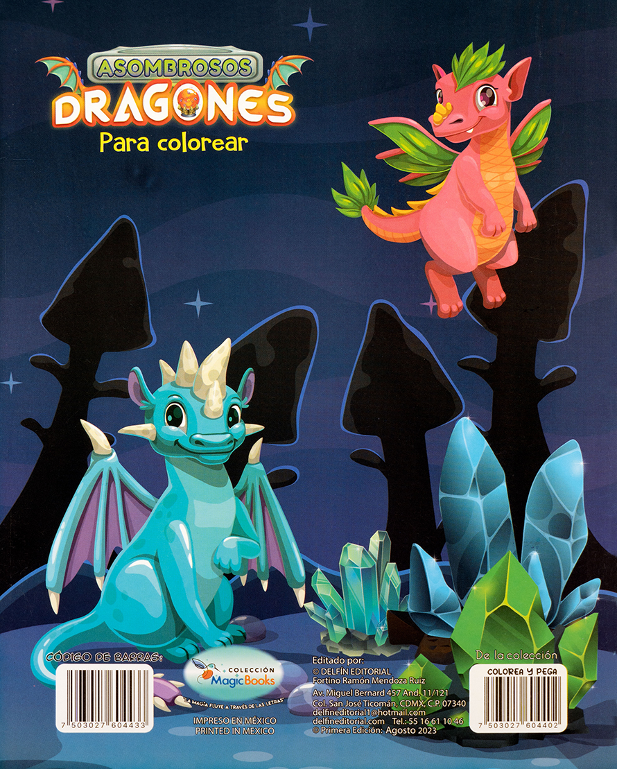 Asombrosos Dragones – Para colorear transporta a los niños a un mundo fantástico habitado por dragones coloridos y simpáticos. Cada página ofrece ilustraciones listas para dar vida con colores, estimulando la creatividad y la imaginación. Además, incluye una planilla de stickers para complementar la experiencia, lo que lo convierte en una actividad doblemente divertida. Ideal para fomentar la motricidad fina y la creatividad en pequeños artistas.