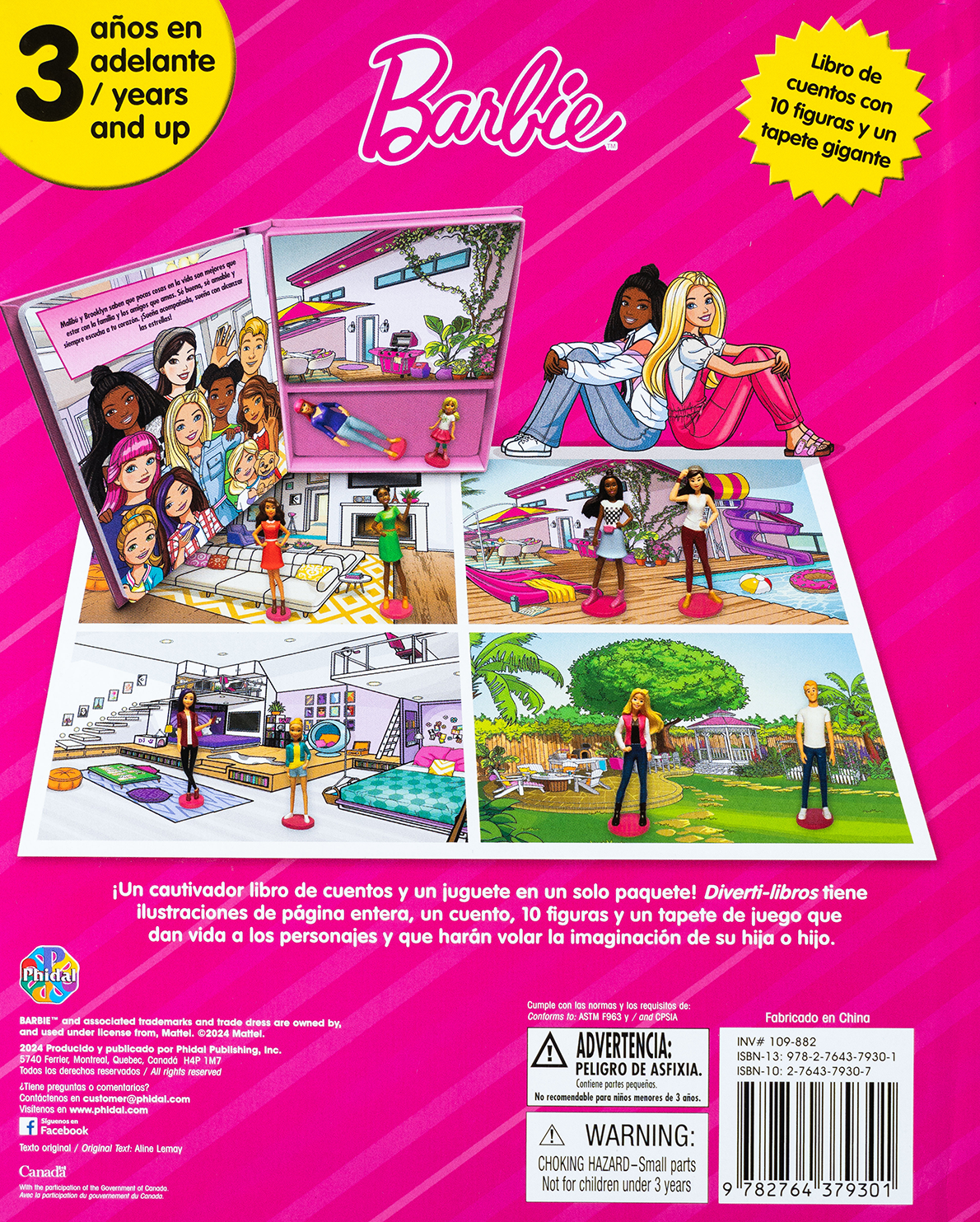 Con Barbie, ¡todo es posible! Este Diverti-libro invita a las niñas y niños a explorar historias de amistad, aventuras en casa y diversión creativa. Incluye un cuento ilustrado, 10 figuras de personajes y un tapete gigante con diferentes espacios de juego como el jardín, la sala y el dormitorio. Diseñado para estimular la imaginación, el juego de roles y la creatividad a partir de los 3 años.