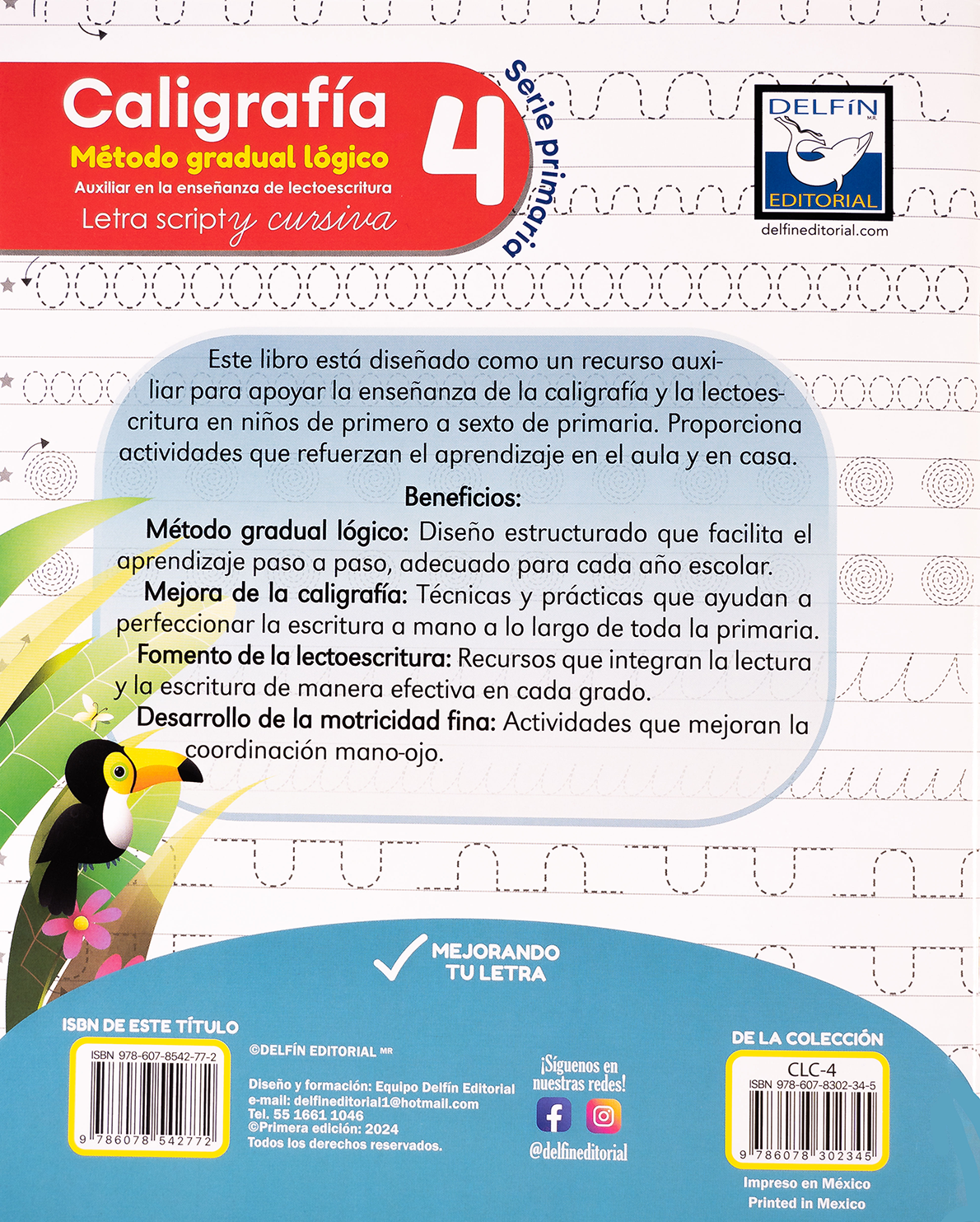 Caligrafía 4 – Método gradual lógico es un recurso diseñado para apoyar el aprendizaje de la caligrafía y la lectoescritura en niños de primero a sexto de primaria. Este libro incluye ejercicios estructurados en letra script y cursiva que desarrollan habilidades clave como la coordinación mano-ojo, el trazo correcto y la fluidez en la escritura.