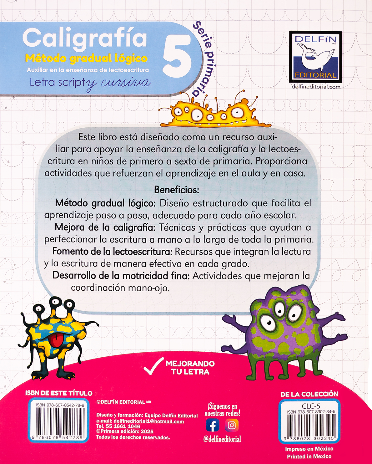 Caligrafía 5 – Método gradual lógico es un auxiliar en la enseñanza de la lectoescritura, diseñado para alumnos de primero a sexto de primaria. A través de un enfoque estructurado, este libro guía paso a paso el desarrollo de la escritura a mano con letra script y cursiva, fomentando la claridad y el buen trazo.