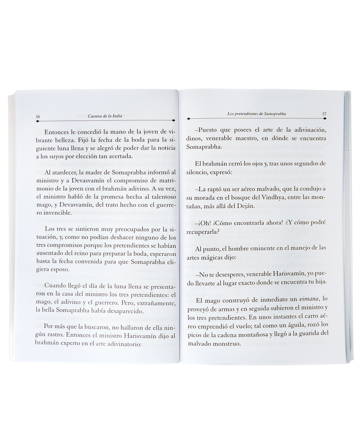 Tesoro de la literatura antigua, Cuentos de la India reúne relatos tradicionales inspirados en la sabiduría oriental, donde se abordan temas universales como el amor, el valor, la aventura, la autorrealización, la trascendencia y el destino. Cada historia entrelaza la realidad con la magia, la prestidigitación divina y el ingenio humano, mostrando cómo el ser puede superar las pruebas de la vida para alcanzar la felicidad y la sabiduría.