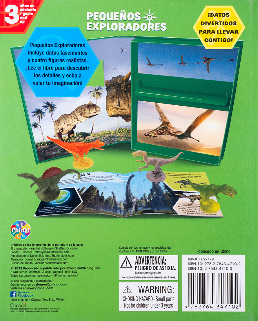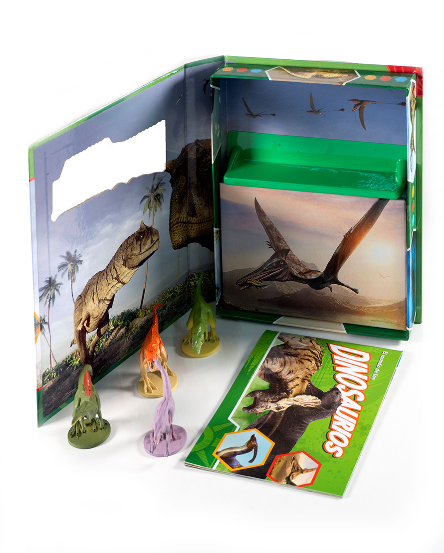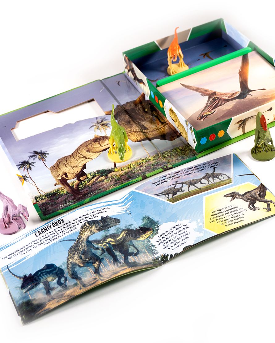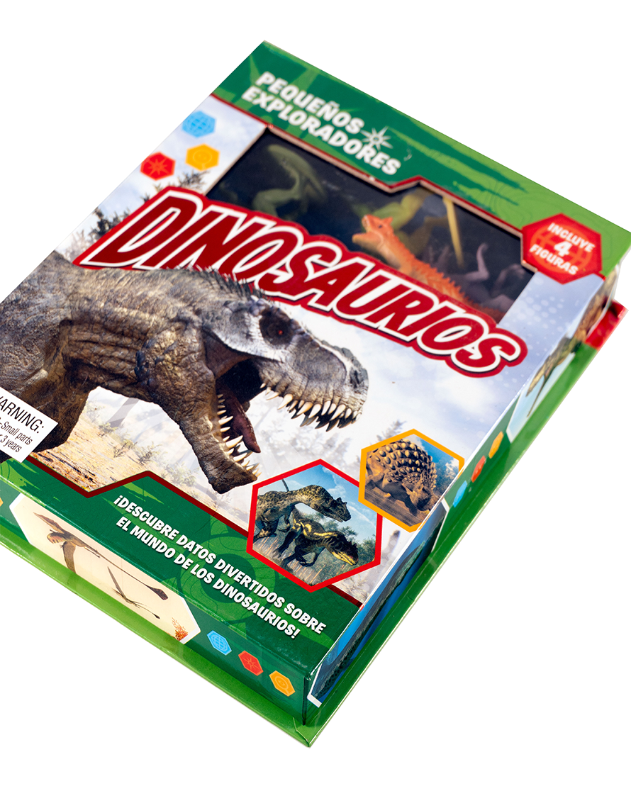 Conoce a los gigantes del pasado con 4 figuras de dinosaurios y un libro repleto de datos sorprendentes.