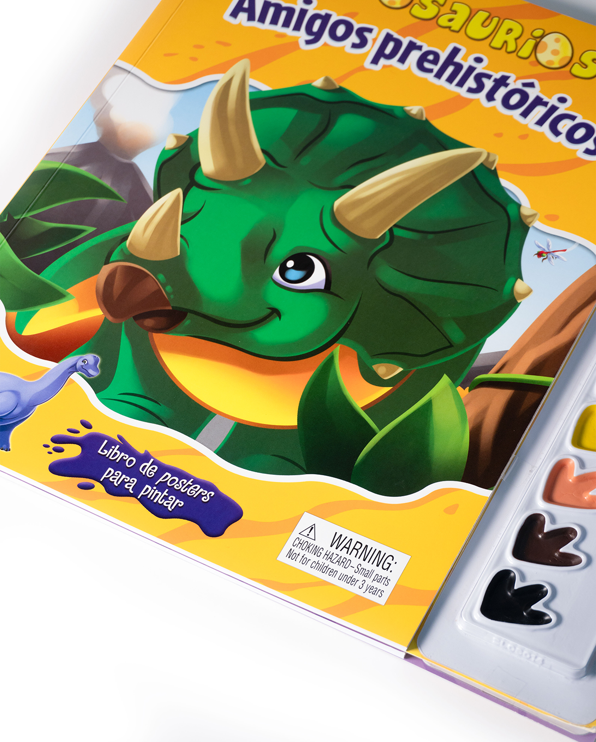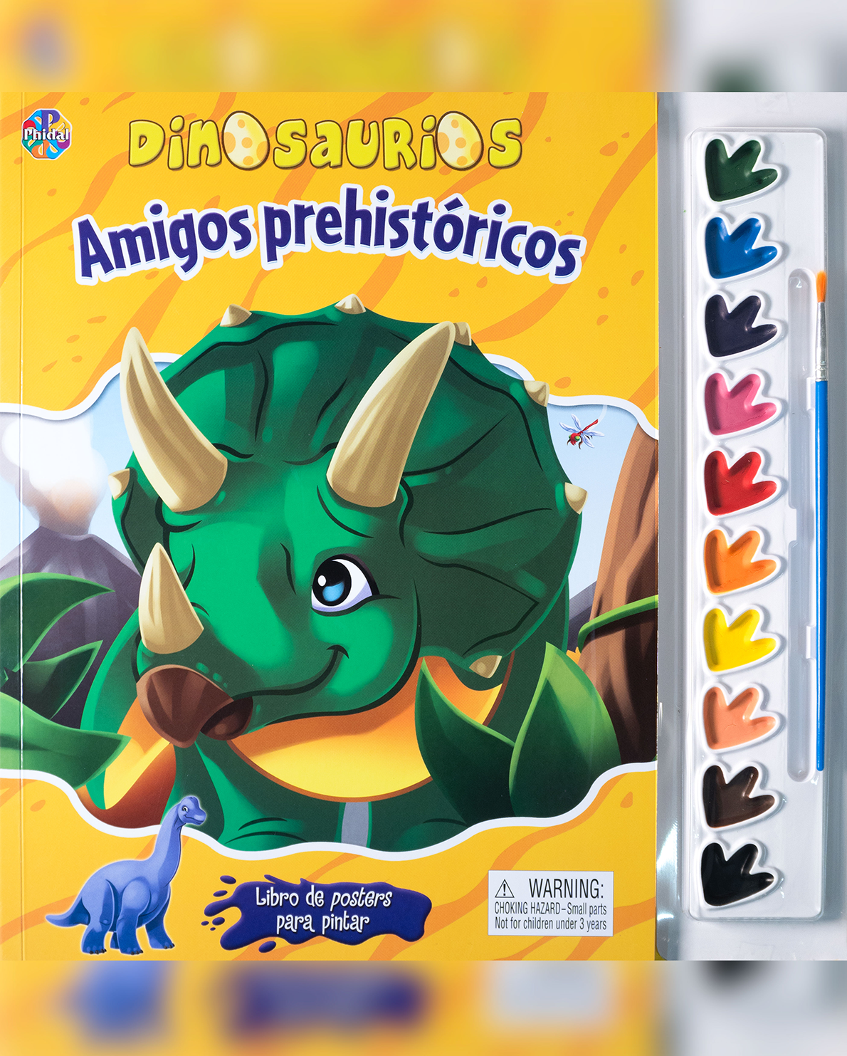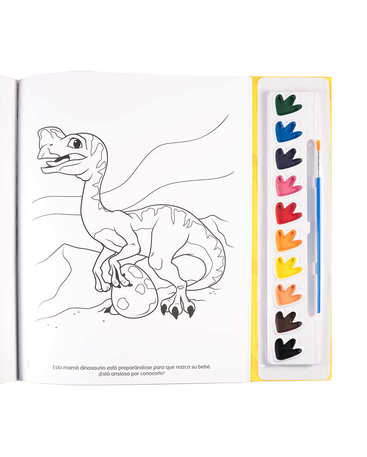 Incluye una paleta de acuarelas y un pincel, listos para usar. Cada página contiene ilustraciones tipo póster con simpáticos dinosaurios como triceratops, tiranosaurios, pterodáctilos y más, esperando ser decorados con la imaginación de los pequeños artistas.
