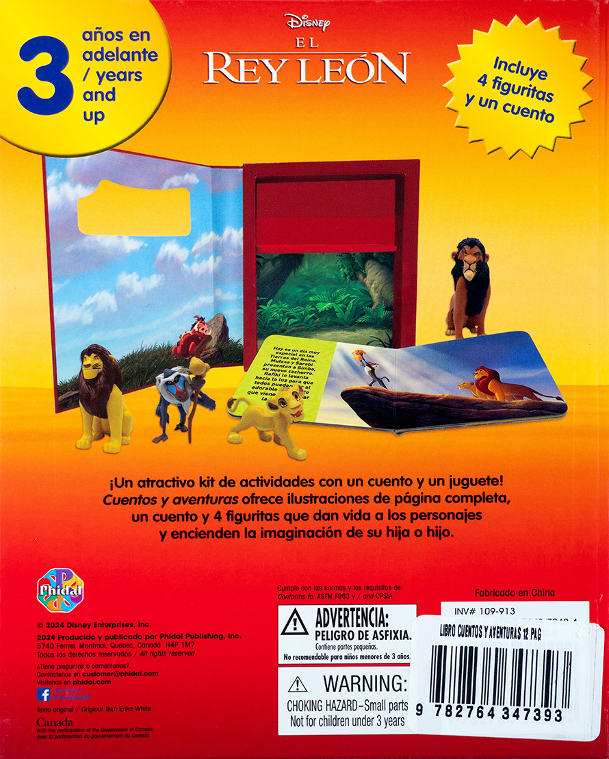 Acompaña a Simba en su viaje para convertirse en rey con este hermoso libro de cuentos y aventuras de El Rey León. El kit incluye 4 figuras (Simba, Nala, Zazú y Scar) y una historia emocionante con ilustraciones coloridas. Ideal para niños desde los 3 años, este set invita a explorar valores como la amistad, el coraje y la familia. ¡Un clásico inolvidable para leer y jugar!