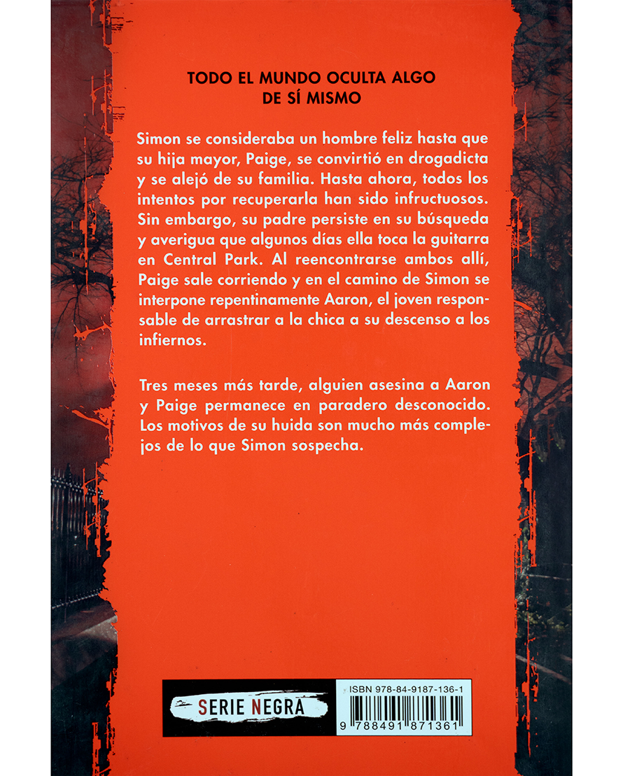 Simon pensaba tener una vida feliz hasta que su hija mayor, Paige, cayó en la drogadicción y desapareció. Cuando finalmente la encuentra en Central Park, comienza una persecución que lo arrastra a un oscuro mundo de secretos y violencia. Tres meses después, Paige sigue desaparecida y el joven que la arrastró a la adicción aparece asesinado. Harlan Coben construye en En fuga una trama adictiva y llena de giros inesperados que revela que todos ocultamos algo… incluso de nosotros mismos.