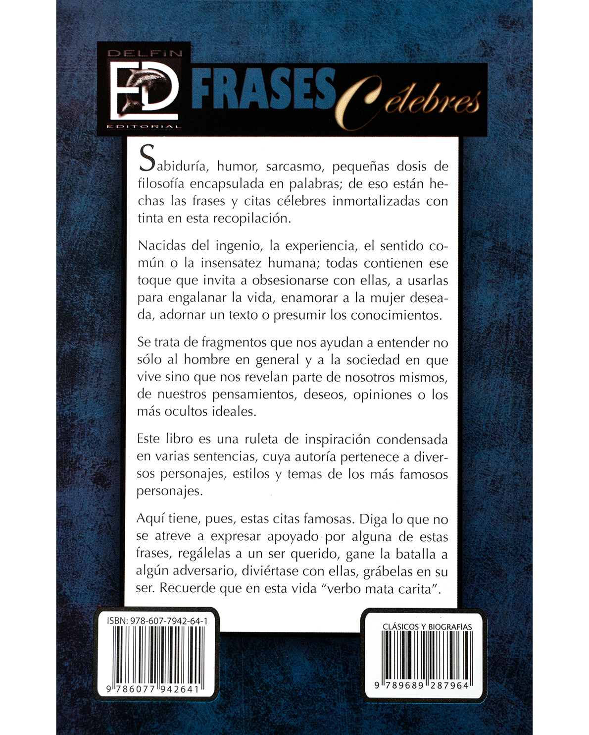“Frases célebres” reúne las citas más ingeniosas, profundas y universales de grandes pensadores, escritores y personajes históricos. Con toques de humor, filosofía y experiencia, este compendio nos invita a reflexionar sobre la vida, el amor, la inteligencia y la naturaleza humana. Perfecto para quienes disfrutan de las palabras con poder, este libro es una fuente de inspiración, cultura y motivación que demuestra que, como dice su contraportada, “en esta vida, verbo mata carita”.