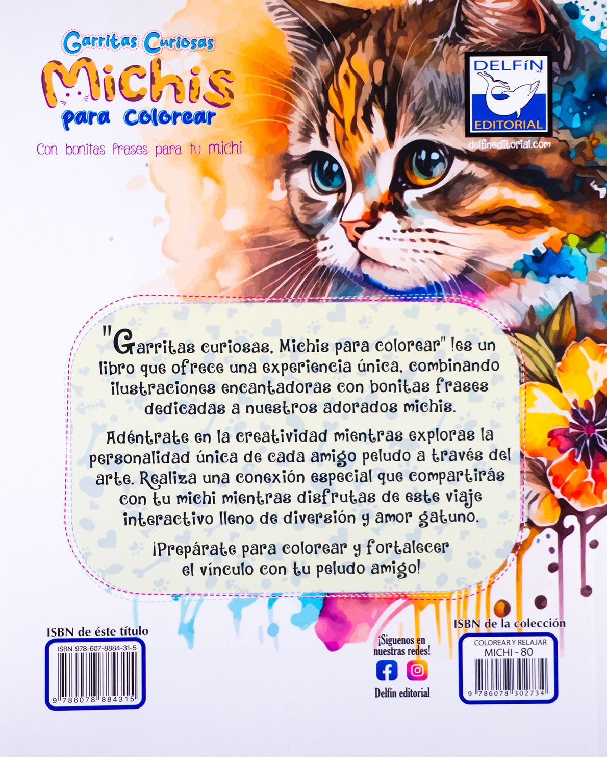 “Garritas Curiosas: Michis para Colorear” es una propuesta única y encantadora de Delfín Editorial que une el arte de colorear con el amor por los gatos. Con 80 páginas llenas de ilustraciones entrañables y frases especiales, este libro invita a los amantes de los michis a relajarse mientras celebran la ternura, curiosidad y personalidad de sus felinos favoritos.