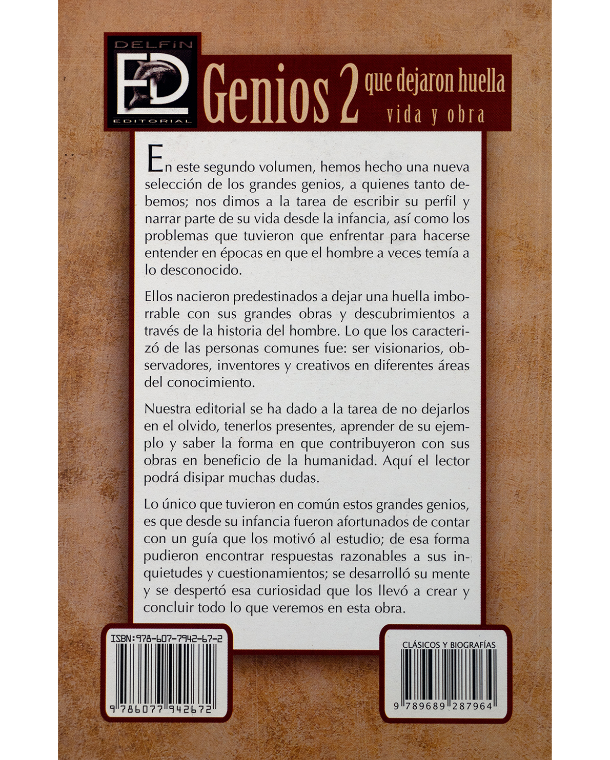 En este segundo volumen, se presenta una nueva selección de personajes brillantes que dedicaron su vida a la ciencia, el arte y el pensamiento. “Genios 2. Que dejaron huella” profundiza en las trayectorias personales de hombres y mujeres visionarios, cuyas ideas y descubrimientos abrieron nuevas rutas para la humanidad. A través de narraciones accesibles y reflexivas, el lector podrá conocer cómo enfrentaron sus dudas, cuestionamientos y retos, y cómo su curiosidad se convirtió en motor del progreso. Un homenaje a la inteligencia, la pasión y el legado de los grandes creadores del conocimiento.