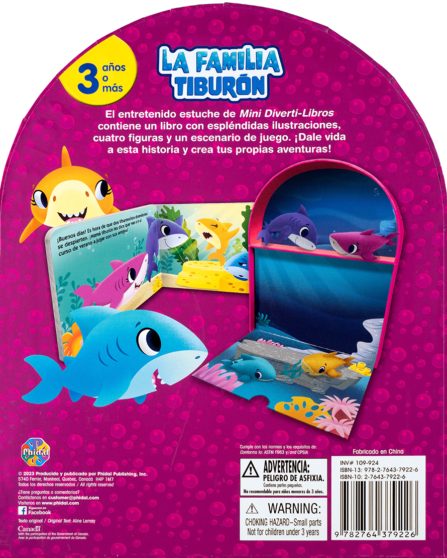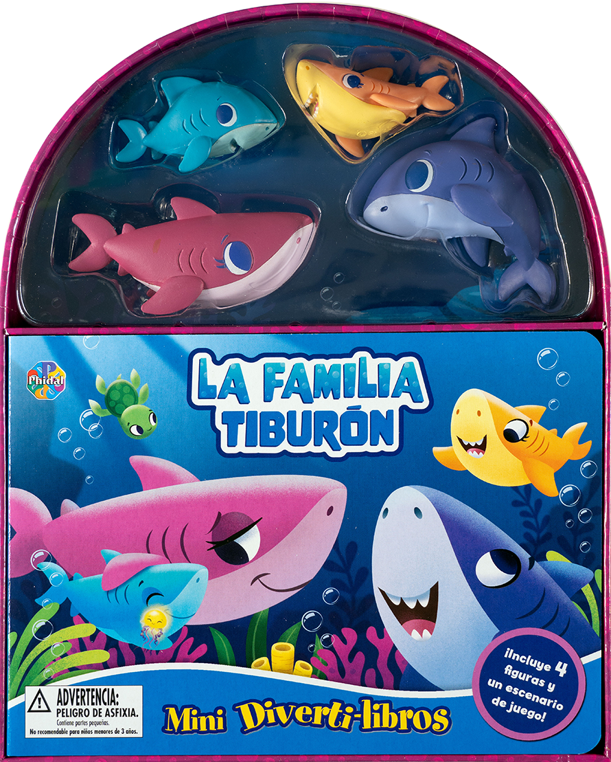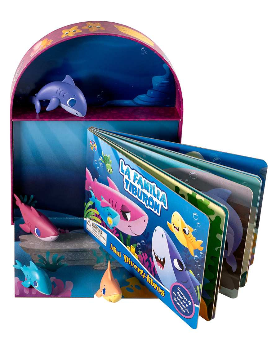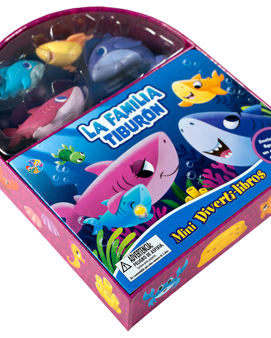 Acompaña a la familia tiburón en sus aventuras bajo el mar con este Mini Diverti-libro lleno de color y diversión. Contiene un libro ilustrado, cuatro figuras de tiburones en diferentes colores y un escenario marino desplegable. Ideal para pequeños fanáticos del océano y los animales marinos.