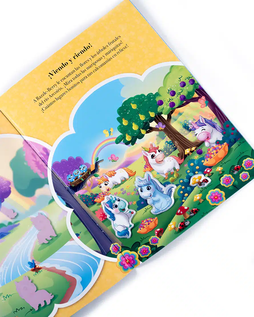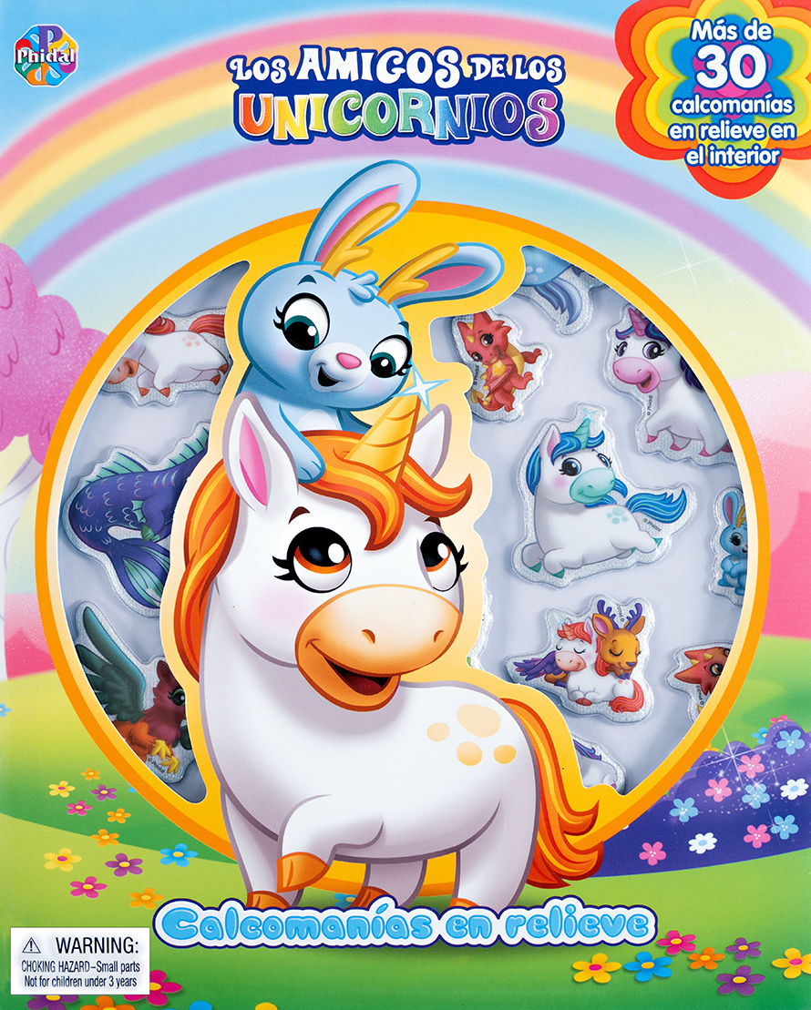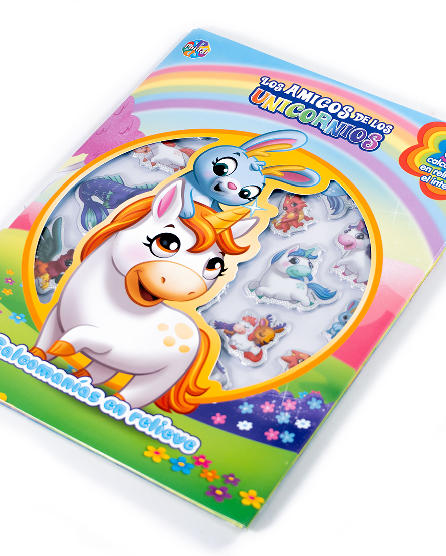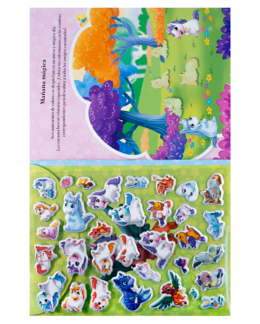 Descubre un mundo mágico de colores y fantasía con unicornios adorables y más de 30 calcomanías en relieve.