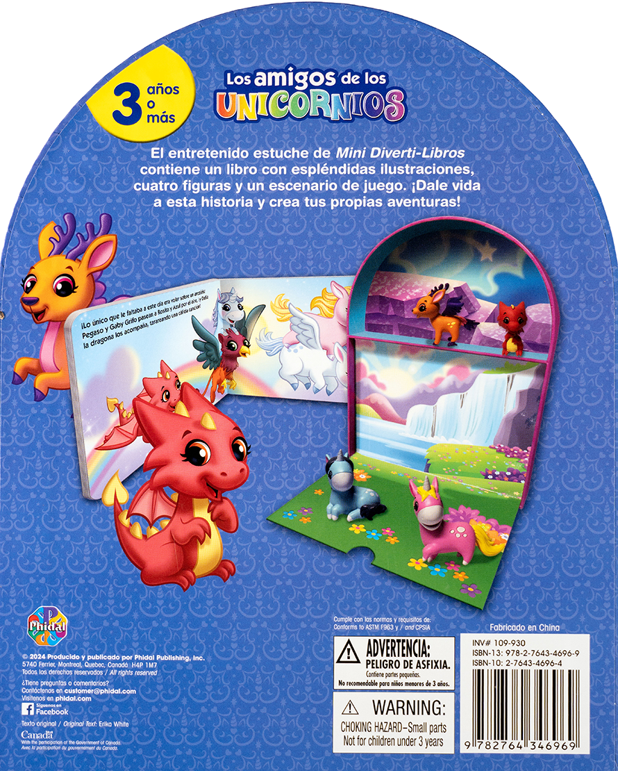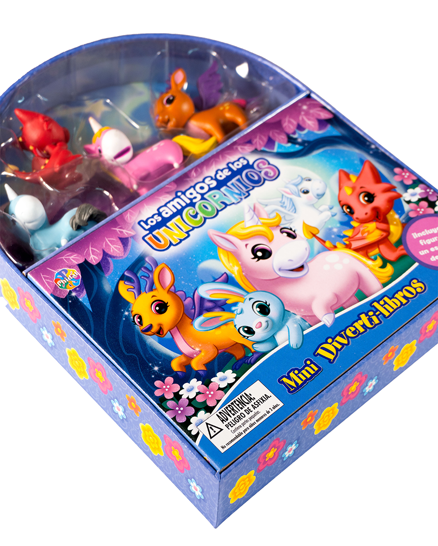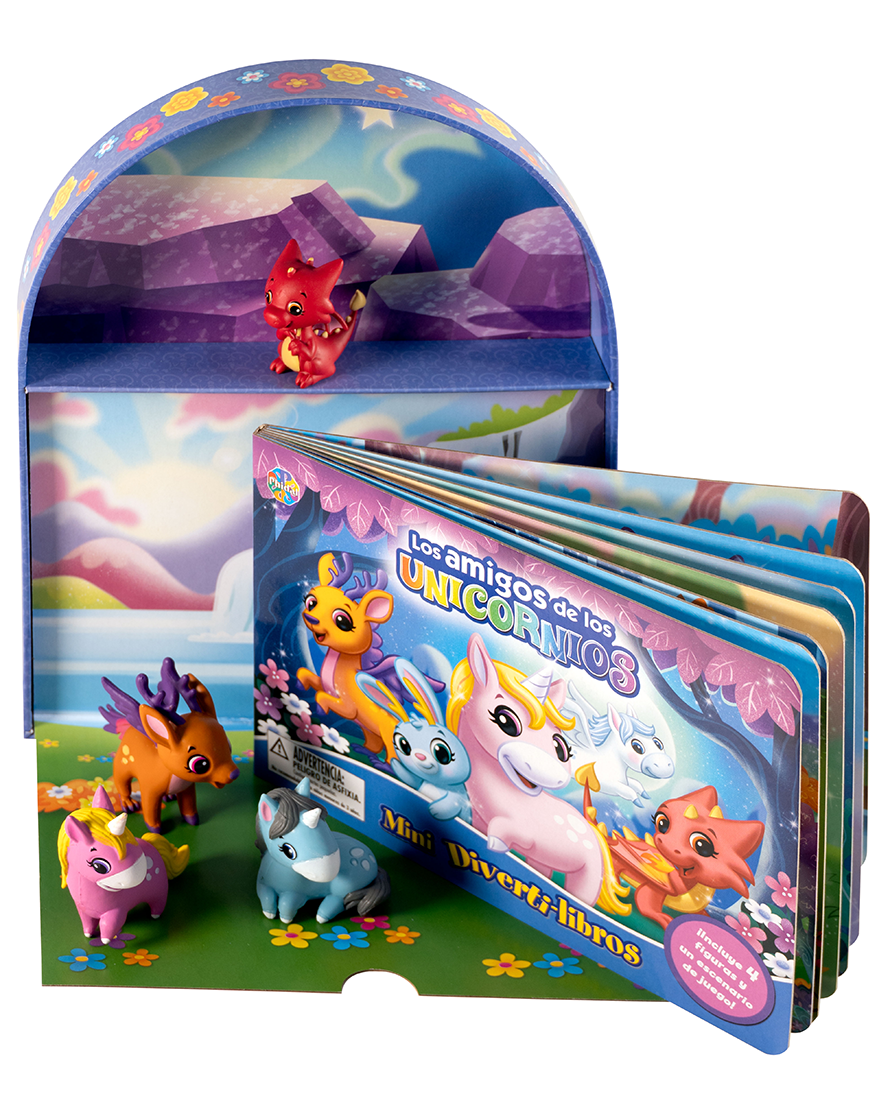 El estuche Los amigos de los unicornios es pura fantasía. Este Mini Diverti-Libro incluye una historia encantadora con ilustraciones brillantes, cuatro figuras de personajes mágicos (como unicornio, dragón y ciervo alado) y un escenario desplegable lleno de color. Pensado para niños desde los 3 años, es ideal para desarrollar la imaginación mientras se sumergen en un mundo fantástico lleno de aventuras.