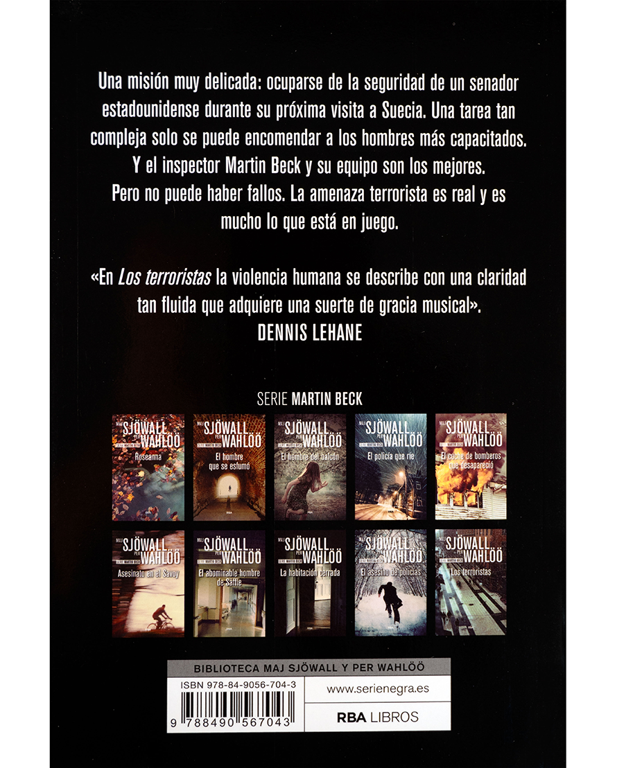 El inspector Martin Beck y su equipo deben proteger a un senador estadounidense en visita oficial a Suecia. Pero lo que parece un encargo de seguridad rutinario pronto se convierte en una carrera contrarreloj contra una amenaza terrorista real. Con una tensión que no da respiro, Los terroristas combina crítica social y suspense policial en una entrega clave de la legendaria serie sueca de Sjöwall y Wahlöö, pioneros del género nórdico de la novela negra.