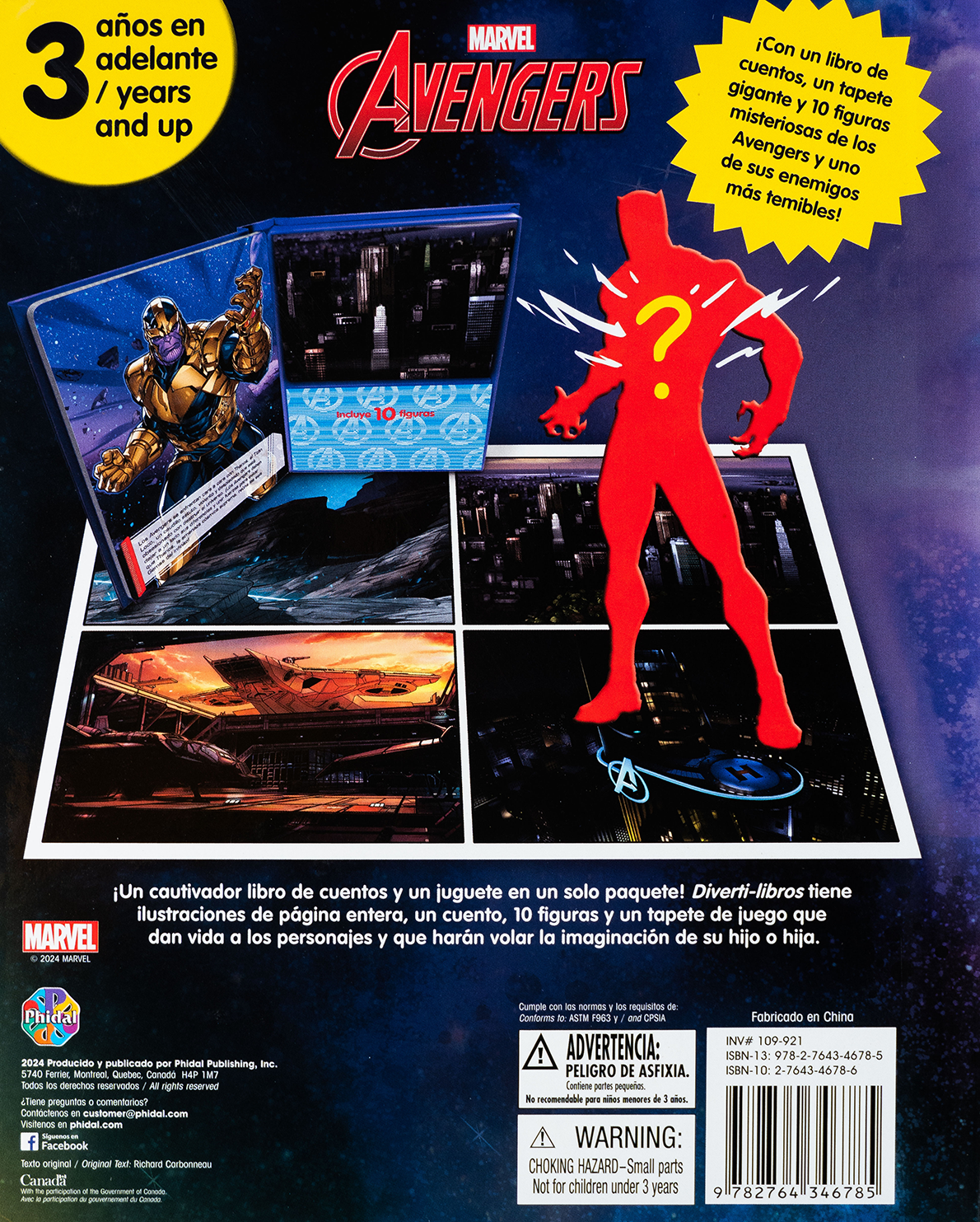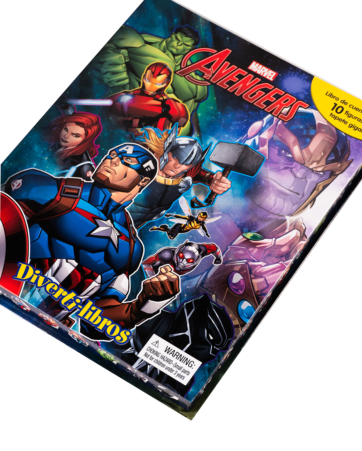 Acompaña a tus héroes favoritos con el Diverti-libro de Avengers. Incluye un cuento épico a todo color, un tapete gigante con escenarios de acción y 10 figuras sorpresa de los Vengadores y sus enemigos más temibles. Una experiencia completa de juego que estimula la imaginación y el gusto por la lectura en los niños. Recomendado para mayores de 3 años.