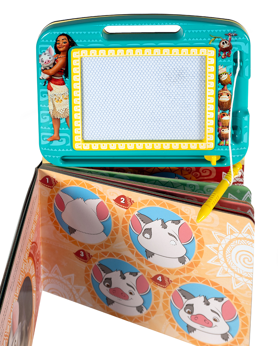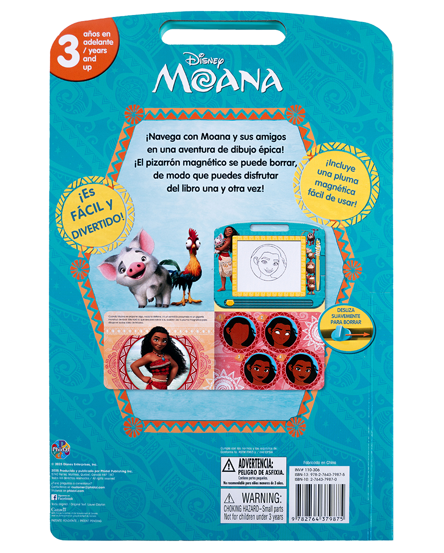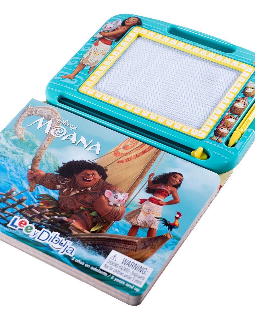 ¡Navega con Moana y sus amigos en una aventura de dibujo épica! Este libro incluye una pizarra magnética reutilizable y una pluma magnética perfecta para manos pequeñas. Dibuja, borra y vuelve a empezar mientras exploras el mundo de Moana. Ideal para fomentar la creatividad de niñas y niños a partir de 3 años.