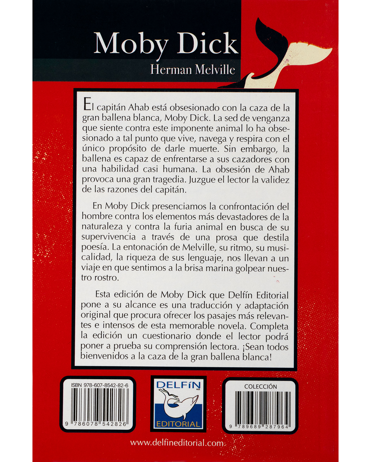 Herman Melville narra en Moby Dick la apasionante travesía del capitán Ahab, un hombre consumido por su deseo de venganza contra la gran ballena blanca que le arrebató una pierna. A través de esta persecución sin tregua, el autor reflexiona sobre la locura, el poder y la insignificancia humana ante las fuerzas de la naturaleza. Con una prosa poética y profunda, esta obra maestra transporta al lector a los mares del siglo XIX, donde cada ola guarda un símbolo y cada tempestad una enseñanza. La edición de Delfín Editorial incluye una sección de autoevaluación para reforzar la comprensión lectora.