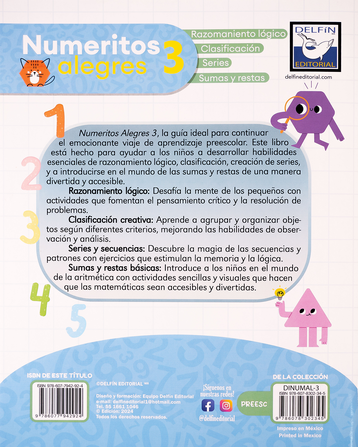 Numeritos Alegres 3 es la guía ideal para continuar el aprendizaje matemático en la etapa preescolar. A través de actividades lúdicas y educativas, ayuda a los niños a desarrollar habilidades esenciales como el razonamiento lógico, la clasificación y la creación de series. Además, introduce de manera sencilla el mundo de las sumas y restas con ejercicios visuales y entretenidos que fomentan la memoria, la observación y el pensamiento crítico. Un recurso perfecto para que las matemáticas sean accesibles y divertidas.