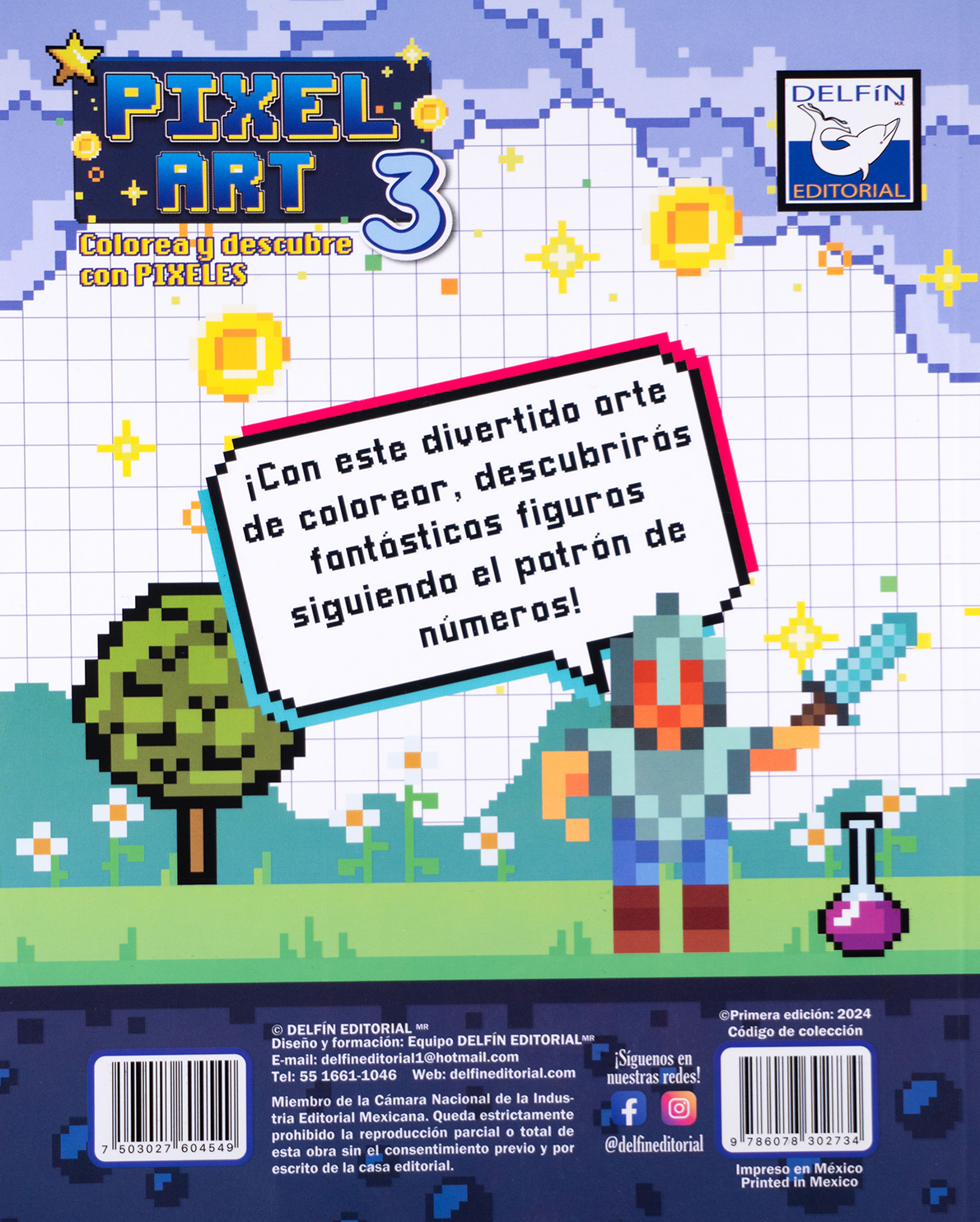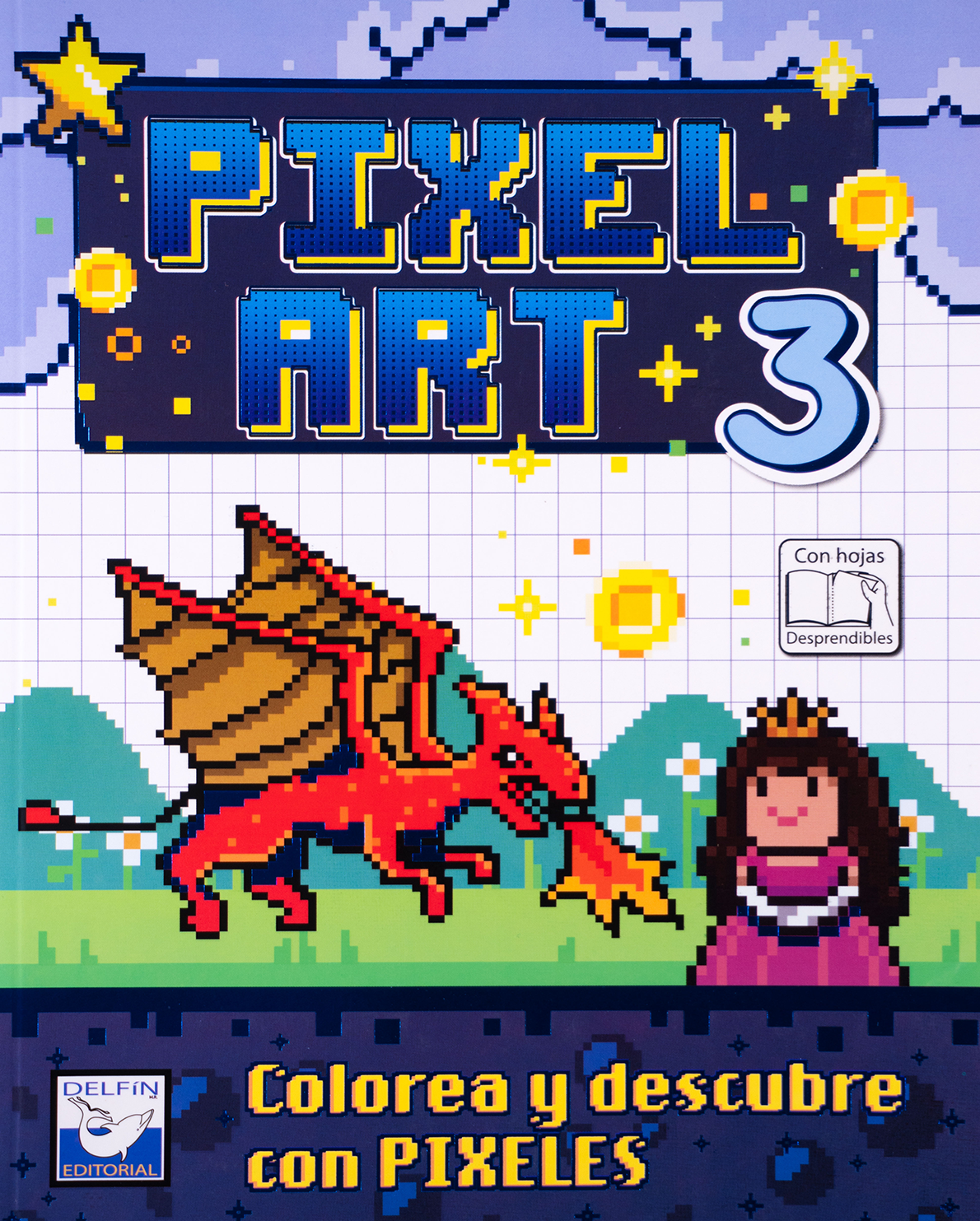 “Pixel Art 3: Colorea y descubre con píxeles” es el tercer volumen de la colección más divertida y creativa de Delfín Editorial. Con 80 páginas llenas de magia pixelada, esta entrega lleva la experiencia de colorear al siguiente nivel, con nuevas figuras por descubrir en un universo visual que recuerda a los videojuegos clásicos.