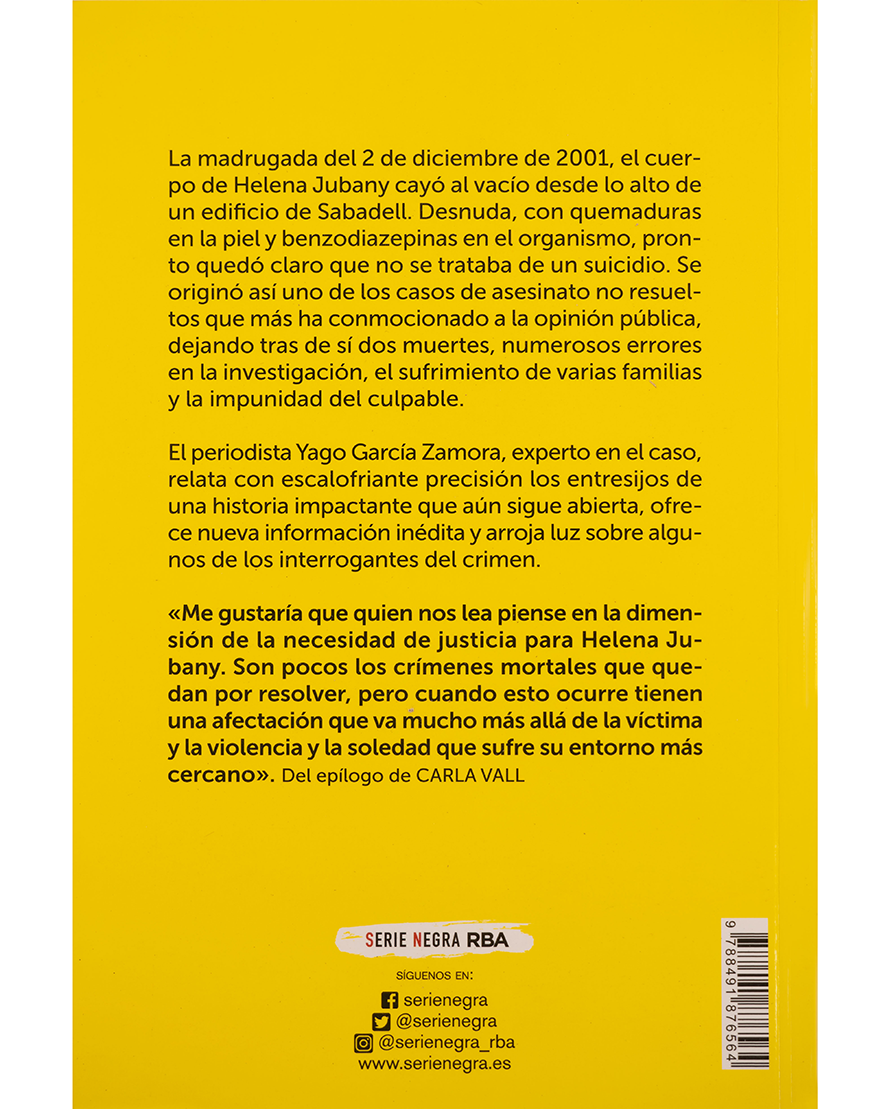 La misteriosa muerte de Helena Jubany, ocurrida en 2001 en Sabadell, sigue siendo un caso abierto que conmocionó a la opinión pública. El periodista Yago García Zamora reconstruye con rigor e información inédita los errores de la investigación, el sufrimiento de las familias y la impunidad del culpable. Con un epílogo de Carla Vall, este libro no solo relata un crimen escalofriante, sino que subraya la necesidad urgente de justicia.