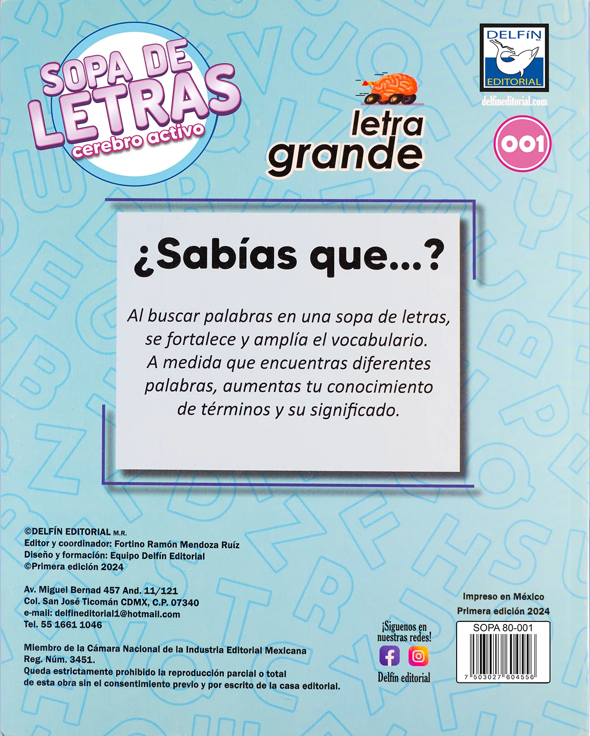Sopa de Letras: Cerebro Activo – Letra Grande 001 es una propuesta editorial divertida y educativa de Delfín Editorial. Diseñado especialmente con letra grande, este cuaderno es ideal para quienes buscan ejercitar su mente de manera clara y cómoda, sin forzar la vista.