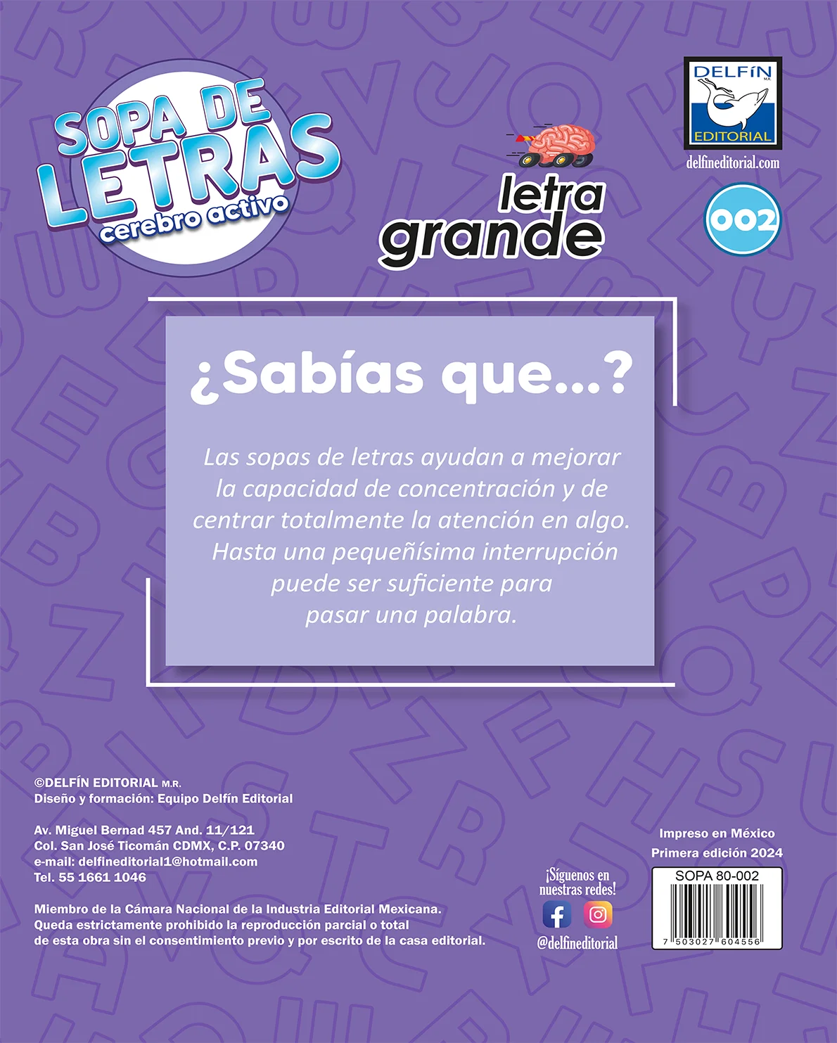 Sopa de Letras: Cerebro Activo – Letra Grande 002 es una propuesta editorial divertida y educativa de Delfín Editorial. Diseñado especialmente con letra grande, este cuaderno es ideal para quienes buscan ejercitar su mente de manera clara y cómoda, sin forzar la vista.