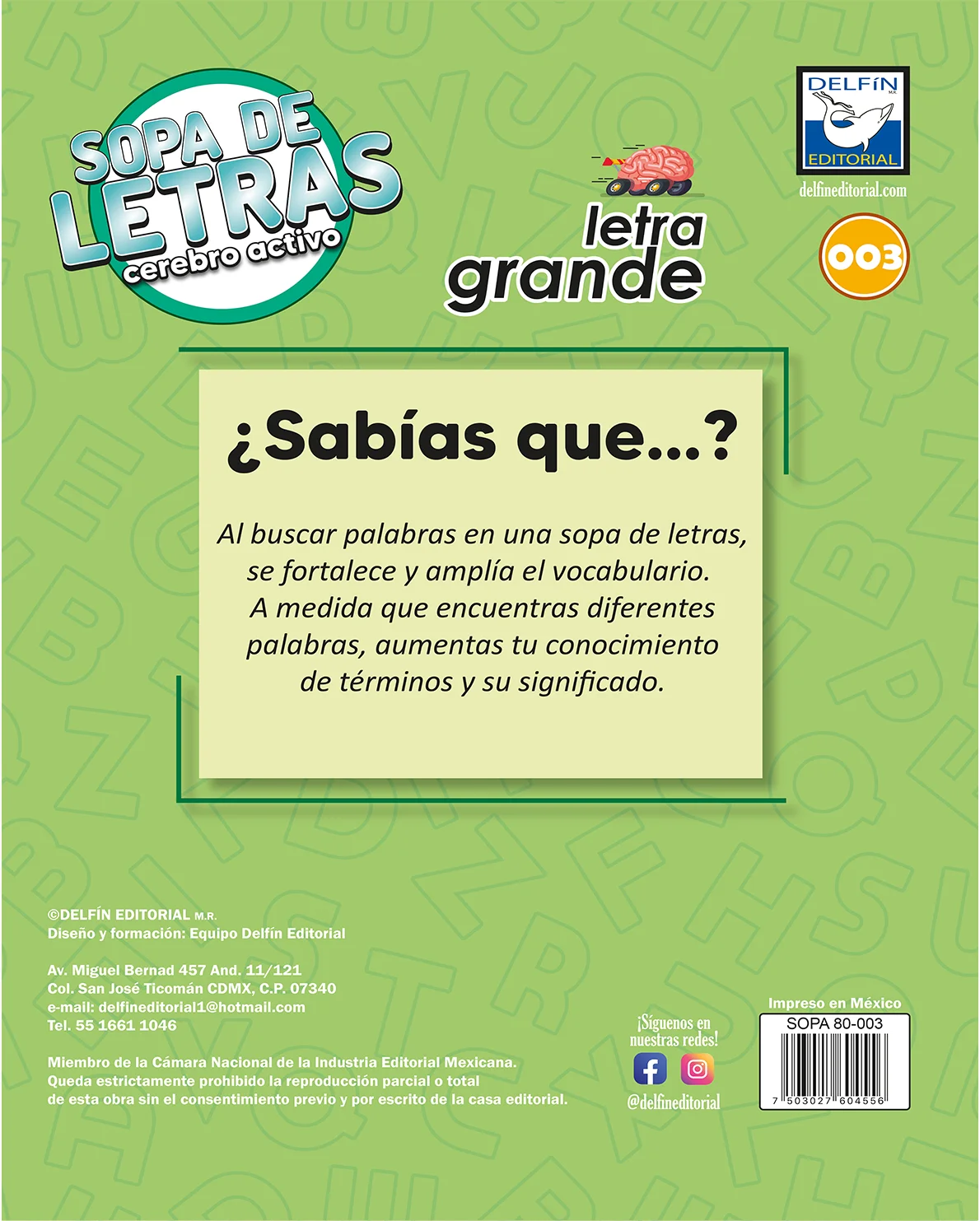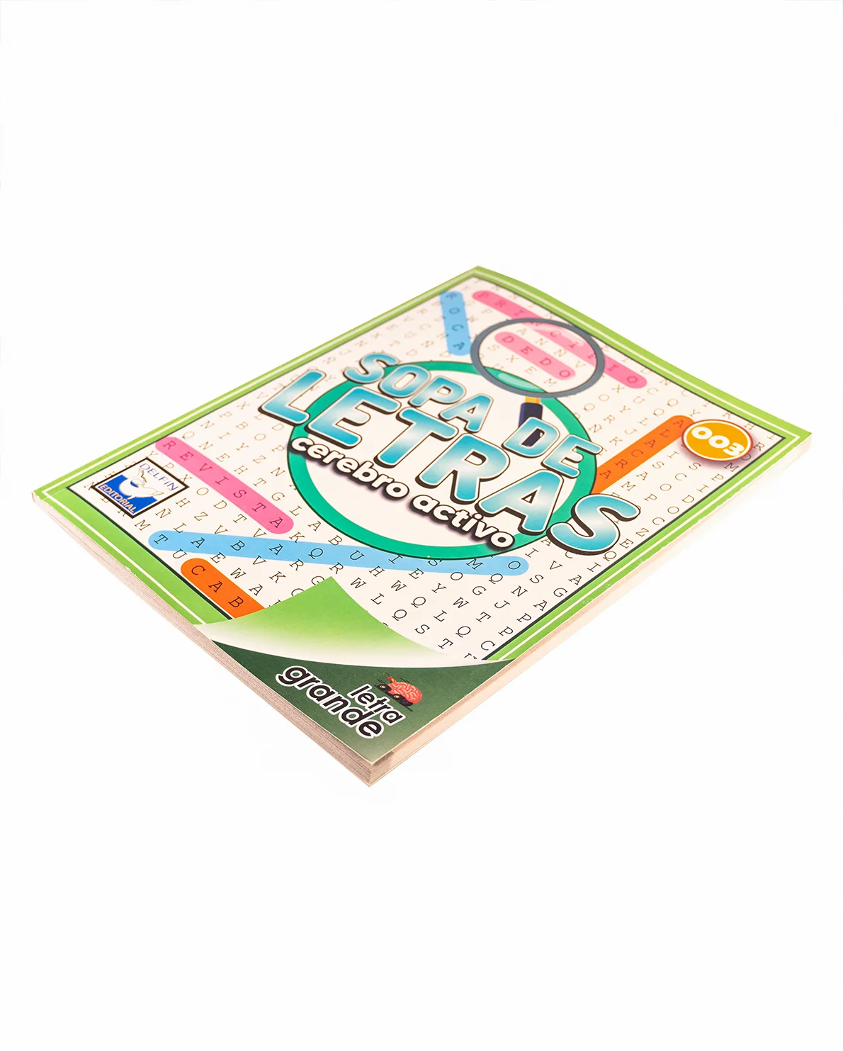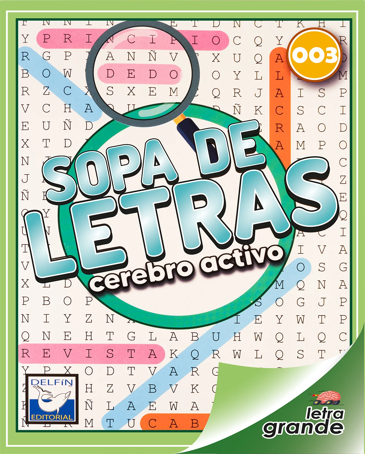 Sopa de Letras: Cerebro Activo – Letra Grande 003 es una propuesta editorial divertida y educativa de Delfín Editorial. Diseñado especialmente con letra grande, este cuaderno es ideal para quienes buscan ejercitar su mente de manera clara y cómoda, sin forzar la vista.