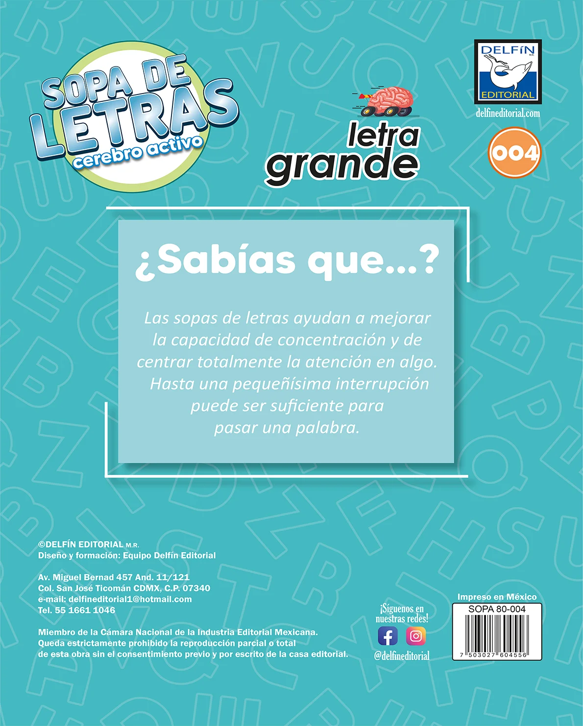 Sopa de Letras: Cerebro Activo – Letra Grande 004 es una propuesta editorial divertida y educativa de Delfín Editorial. Diseñado especialmente con letra grande, este cuaderno es ideal para quienes buscan ejercitar su mente de manera clara y cómoda, sin forzar la vista.