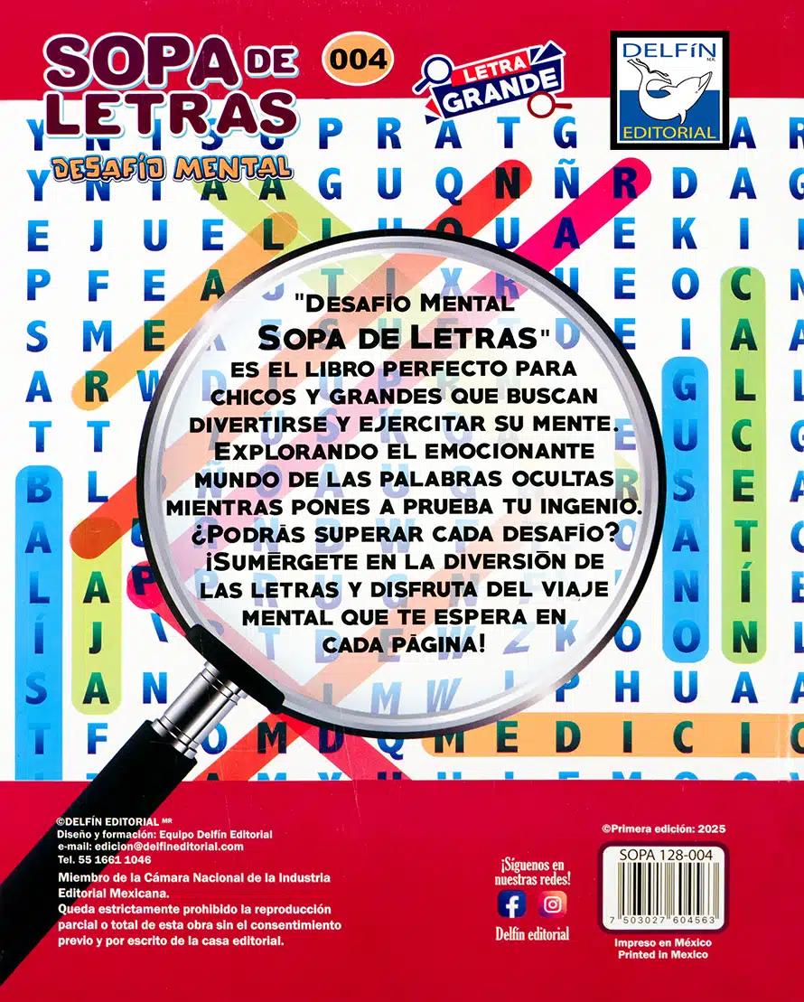 Desafío Mental – Sopa de Letras 004 es el libro perfecto para quienes disfrutan resolver retos y mantener la mente activa. Diseñado con letra grande para facilitar la lectura, incluye múltiples sopas de letras con diferentes temáticas que pondrán a prueba tu ingenio. Ideal tanto para jóvenes como adultos que buscan un pasatiempo entretenido, educativo y accesible. Cada página representa un nuevo reto que te hará ejercitar tu concentración y memoria mientras te diviertes.