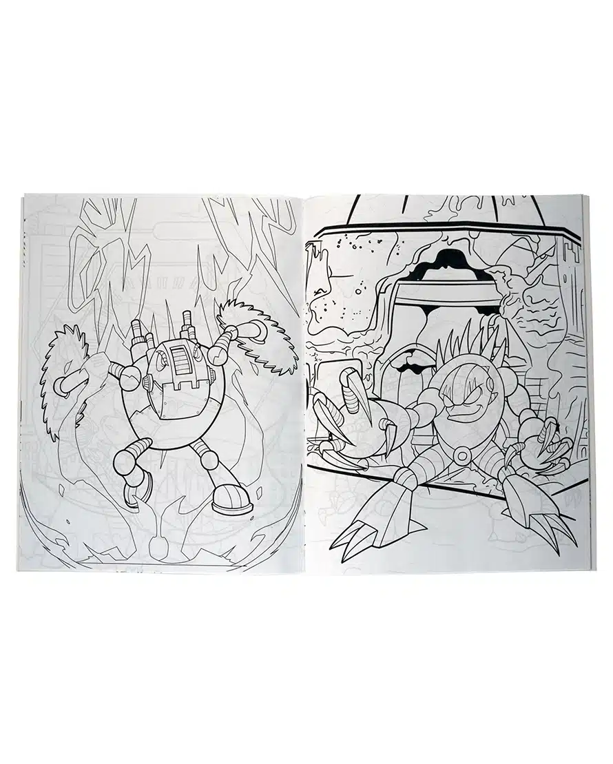 Robots gigantes y dinosaurios mecánicos te esperan en este libro para colorear lleno de acción futurista.