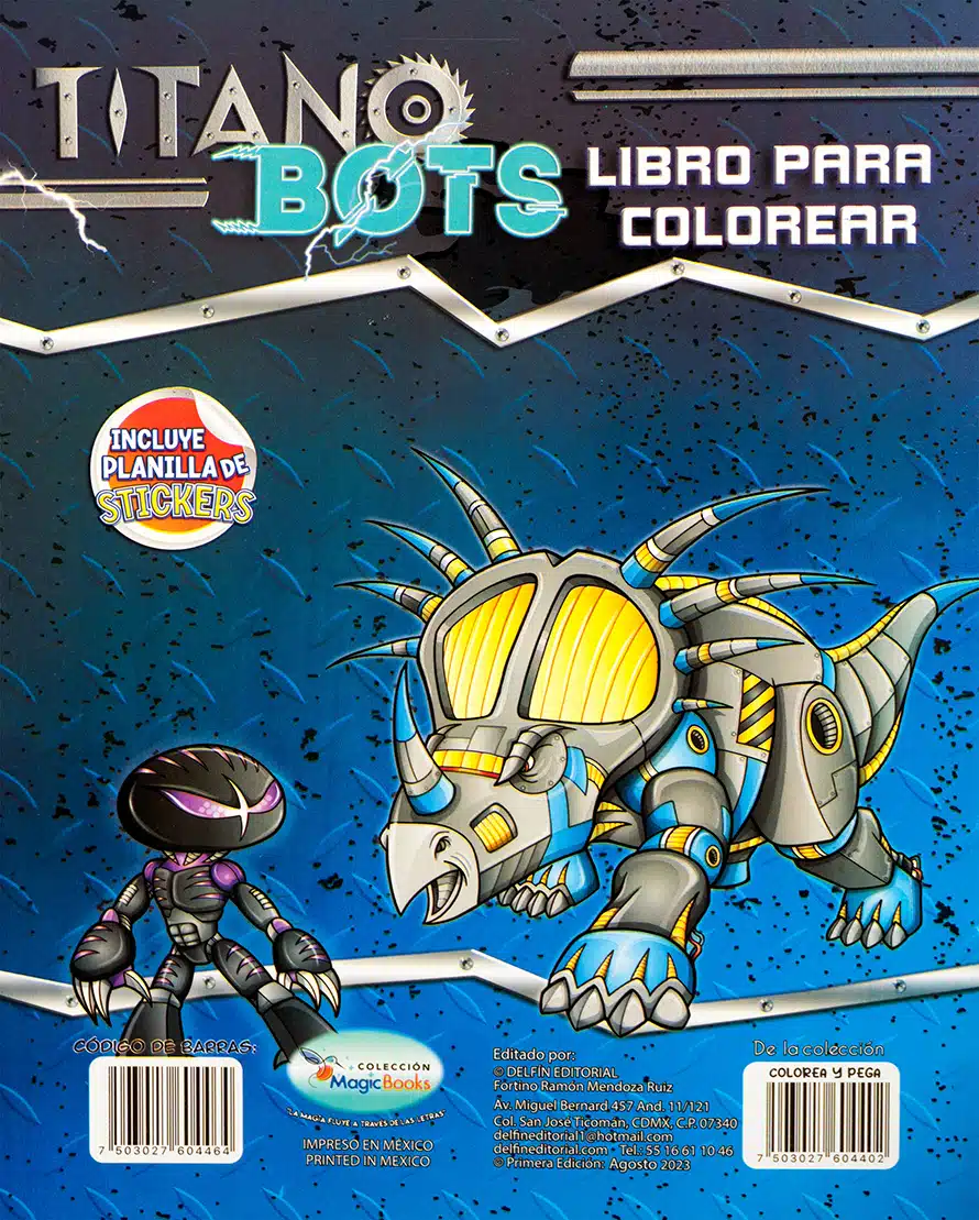 TitanoBots – Libro para colorear combina lo mejor de dos mundos: robots y dinosaurios. Con ilustraciones impactantes de criaturas mecánicas listas para la batalla, este libro invita a niños y jóvenes a dejar volar su imaginación. Cada página está diseñada para estimular la creatividad y la diversión. Incluye una planilla de stickers exclusivos para complementar el juego y la personalización.